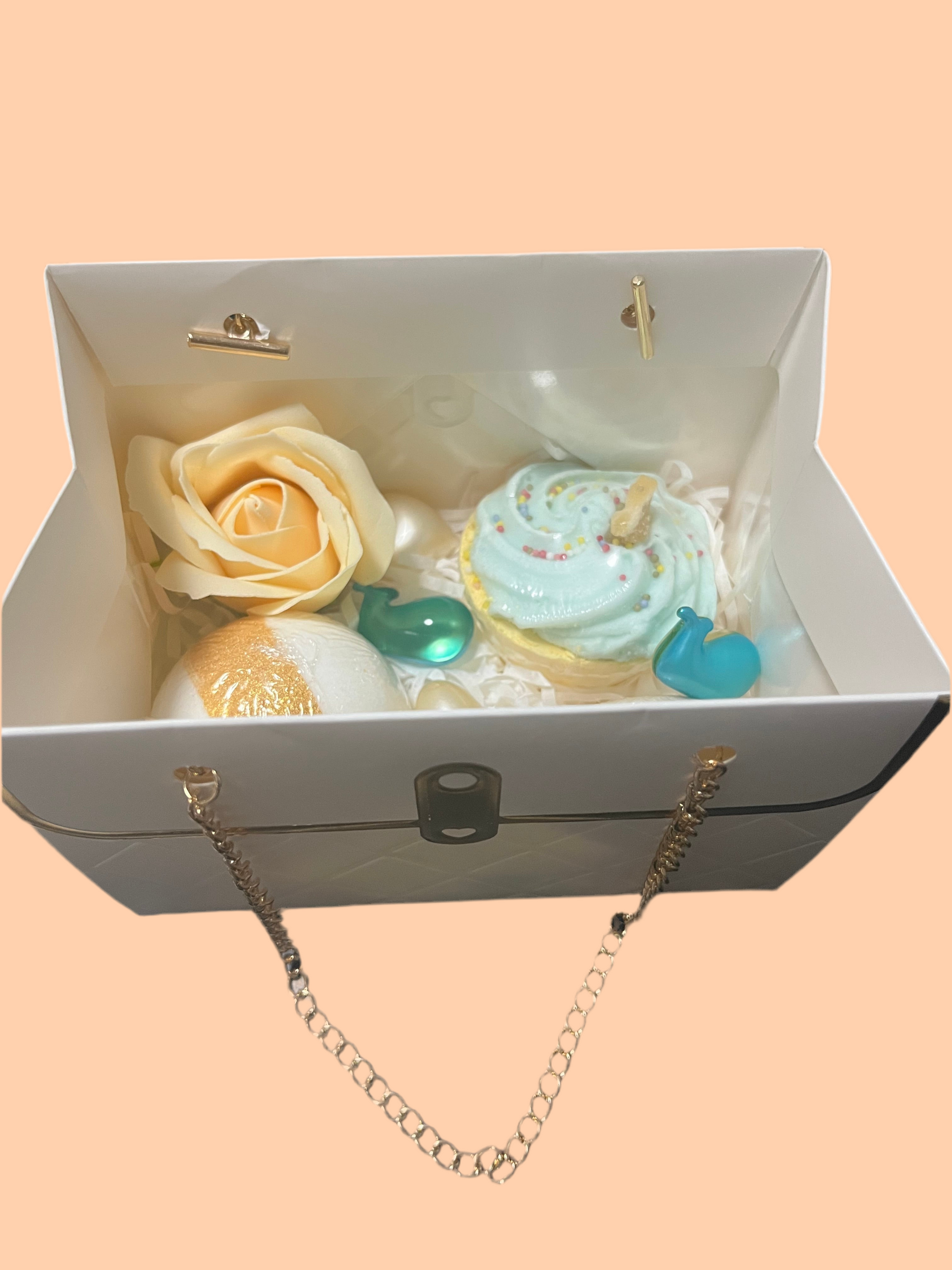 boite: 1 boule de bain florale, 2 macarons ( pêche - fraise), 5 perles de bain ( vanille - monoï), 1 fleur en savon